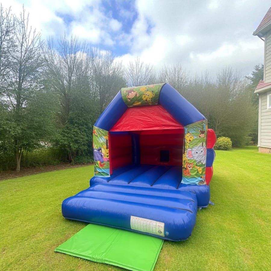 Bouncy Castle Hire In Essex Jungle Fun Bouncy Castle Red & Blue (12ft x 15ft) HEIGHT 9.9ft in Wickford, Chelmsford, Thurrock, Billericay is a vibrant, safe choice for parties and events. This red & blue Jungle Fun bouncy castle measures 12ft x 15ft. It has a sewn-in roof and is fully enclosed for maximum safety. Bright colours and a universal colourway make it ideal for birthdays, school fairs and family events. 🐒🎉