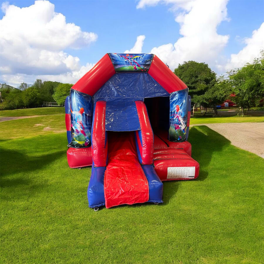 Bouncy Castle Hire in Essex Football Super Front Slide Combo (Red & Blue) in Shotgate, Romford, Rainham, Thurrock — perfect for birthdays, school fairs and football parties. This football-themed bouncy castle with slide delivers big fun in a compact 12ft x 16ft footprint. ⚽🛝