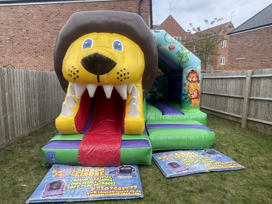 Book your bouncy castle hire Essex 3D King of The Jungle Front Slide Combi Bouncy Castle with Slide in Basildon, Billericay, Thurrock, Southend on sea today and let your party ROAR with fun and excitement! 🦁🎠