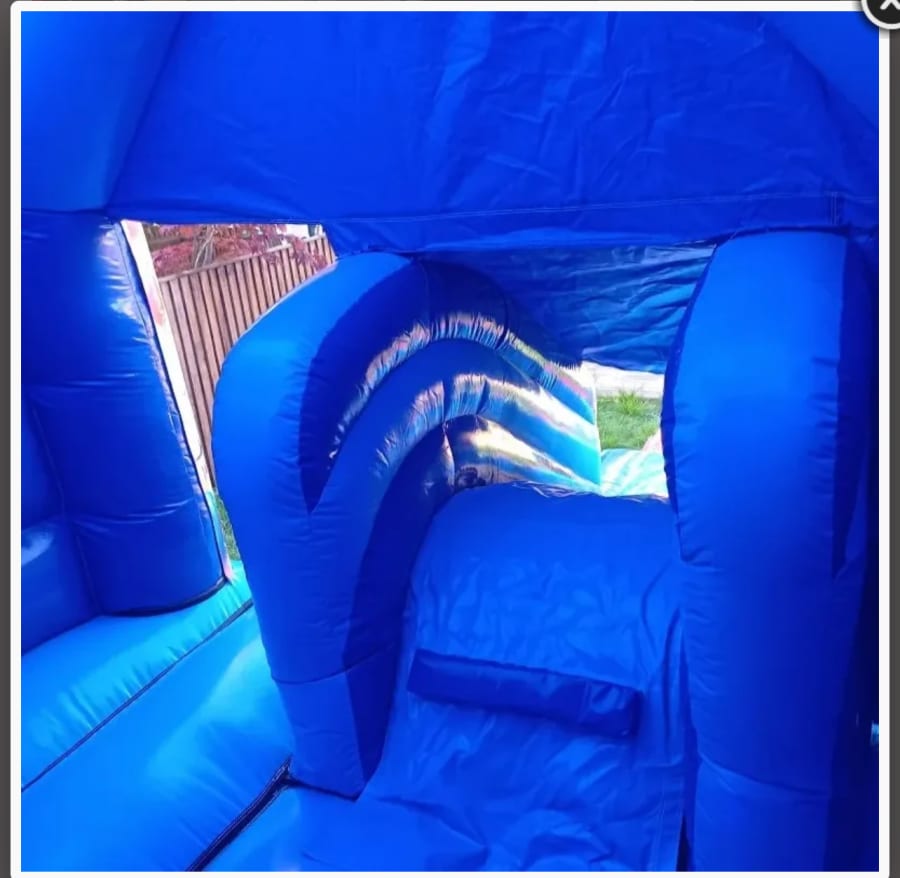 Bouncy castle hire throughout Essex Double Blue Front Slide Bouncy Castle with Slide (12ft x 16ft) HEIGHT 9.6ft in Billericay, Wickford, Basildon, Chelmsford, Rayleigh. 🎉 This vibrant, traditional blue bouncy castle with built-in slide is perfect for kids' parties, community events, and school fun days. It combines bright styling, safe design, and party-ready features like a shower cover and fully enclosed interior. 🕺