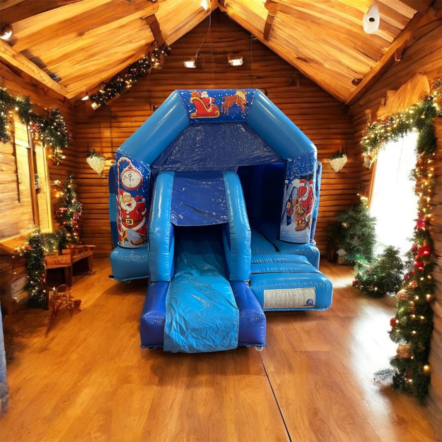 Book our Bouncy Castle Hire in Essex Christmas Mega Front Slide Combi (Blue) in Wickford, Horndon on the Hill, Rayleigh for a show-stopping attraction at your Christmas party. This blue Christmas-themed bouncy castle with slide measures 11ft x 16ft. It delivers safe, high-energy fun for kids and a festive focal point adults love. 🎉