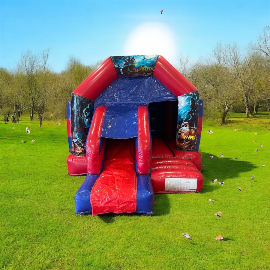 Bouncy Castle Hire Halloween Super Front Slide Combo Castle Red/Blue in Brentwood, Chelmsford, Basildon, Billericay delivers show-stopping party entertainment. This 12ft x 16ft combo castle combines a roomy bounce area, a built-in slide and Halloween-ready colours. It’s perfect for kids’ parties, community events and seasonal celebrations. 👻