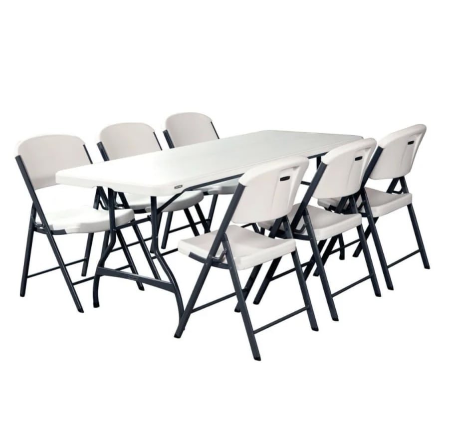 This package is for 18 of the white plastic and metal chairs and 3 catering tables.